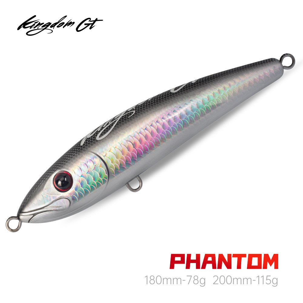 The Kingdom 4566 Phantom GT Stick Bait is a precision-engineered floating saltwater lure designed for targeting tuna and other large game fish. Crafted with a durable ABS plastic body and reinforced by a CNC plate structure, it ensures strength and longevity in demanding conditions. Available in two sizes—180mm/78g and 200mm/115g—this lure features realistic 3D eyes to enhance its lifelike appearance, increasing your chances of a successful catch. Ideal for expert anglers seeking reliable performance in saltwater environments.